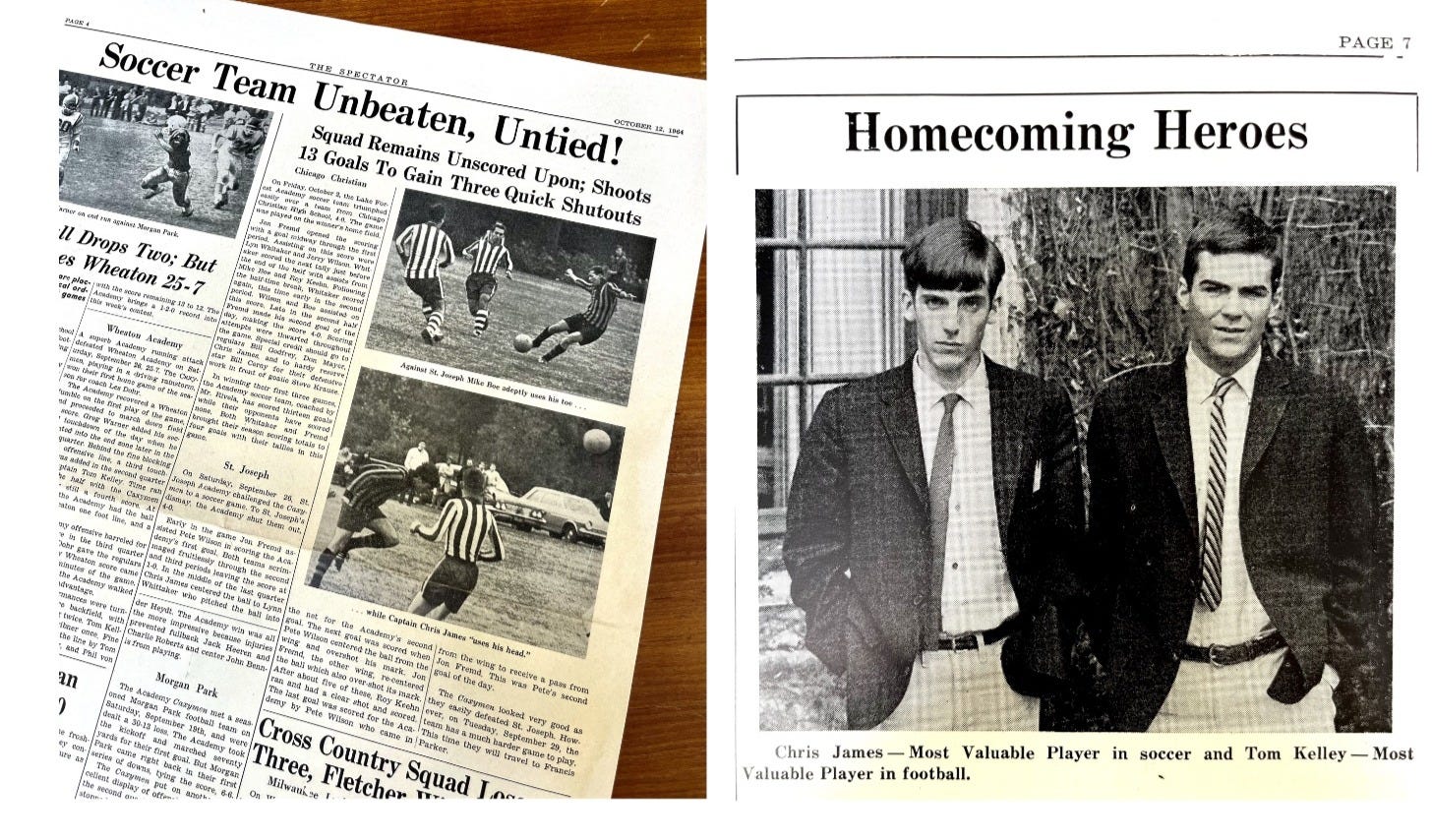 It was no wonder the students at Lake Forest Academy were so cynical. We partook of every scam going. LFA was like a microcosm of life in Mayor Daly’s Chicago. For example, as editor of Reflections I would give preference to stories written by the editor of The Spectator, our school newspaper, in exchange for him writing a glowing description of my heroic performance in soccer against Carleton College or whatever. Things like that were rife and were what I imagine – or probably know – happens daily in the U.S. Senate or House of Commons bar. Thankfully I outgrew corruption of that kind and was never able to play the spoils system after I left school.